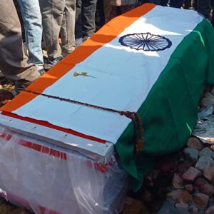 वीर सेनानियों की भूमि बूंगा-चनौदा सोमेश्वर के लाल को सैन्य सम्मान के साथ सलामी देते हुए सेना के जवान,स्थानीय पुलिस प्रशासन,अनेको जनप्रतिनिधि,युवा-महिलाये और विद्यालय के बच्चे मौजूद रहे।