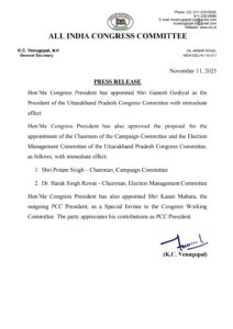 उत्तराखंड कांग्रेस में बड़ा बदलाव — गणेश गोदियाल बने प्रदेश अध्यक्ष, प्रीतम सिंह और हरक सिंह को मिली अहम जिम्मेदारी