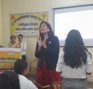 विश्व मानसिक स्वास्थ्य दिवस के अंतर्गत राष्ट्रीय सेवा योजना एवं मनोविज्ञान विभाग के संयुक्त तत्वाधान में दुर्गा महाविद्यालय में एक दिवसीय कार्यशाला का आयोजन किया गया कार्यक्रम में मुख्य वक्ता के रूप में शिल्पा नाहर जी उपस्थित रही प्राचार्य डॉ प्रतिभा मुखर्जी साहूकार ने एक छोटी सी कहानी के माध्यम से अपनी बात रखी उन्होंने अपने स्वागत उद्बोधन में शिल्पा नाहर जी का स्वागत करते हुए कहा की बच्चे निश्चित ही आपके वक्तव्य से लाभान्वित होंगे कार्यक्रम का संचालन राष्ट्रीय सेवा योजना की कार्यक्रम अधिकारी सुनीता चंसोरिया द्वारा किया गया उन्होंने बताया कि