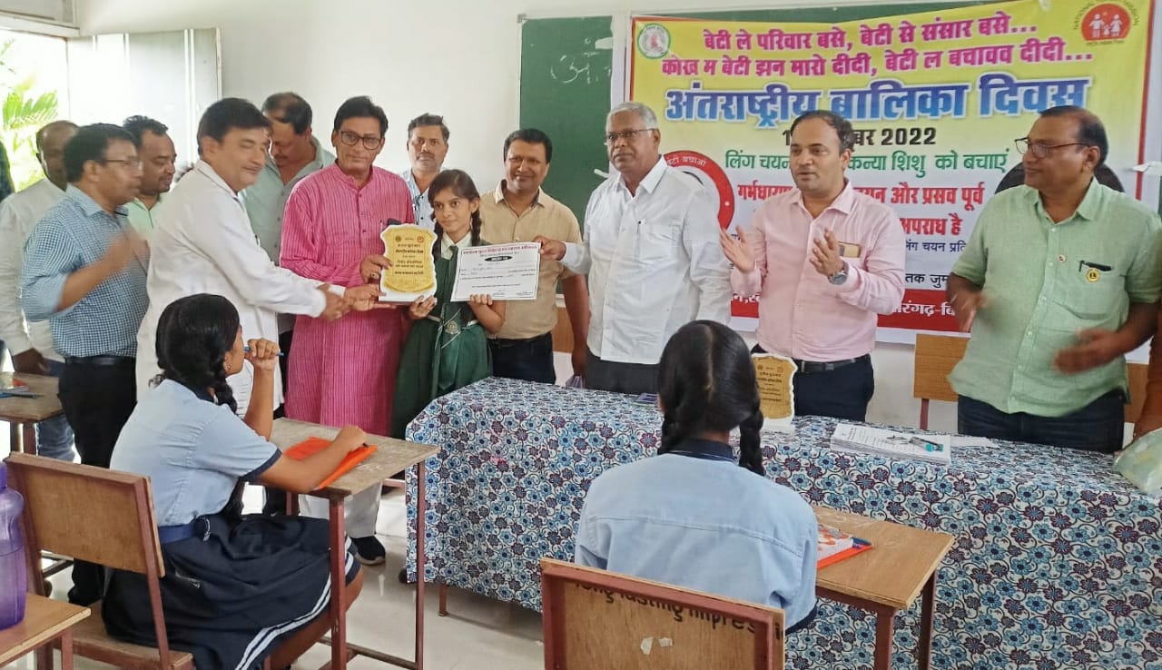 सारंगढ़ छत्तीसगढ़ : कलेक्टर जिला सारंगढ़ बिलाईगढ़ के मार्गदर्शन एवं डॉ एफ आर निराला मुख्य जिला चिकित्सा एवं स्वास्थ्य अधिकारी सारंगढ़ बिलाईगढ़ के मार्गदर्शन में आज दिनाँक 11_10_2022 को अंतरास्ट्रीय बालिका दिवस के अवसर में सी.पी.एम. कॉलेज सारंगढ में अशोका पब्लिक स्कूल, मोना मॉडर्न स्कूल के छात्र सम्मिलित होकर निबंध प्रतियोगिता का आयोजन किया गया। जिसमें गर्भधारण पूर्व लिंग चयन और प्रसव पूर्व लिंग परीक्षण दंडनीय अपराध के बारे में छात्रों को जागरूक किया गया। उक्त अवसर पर जिला चिकित्सा अधिकारी डॉ एस आर निराला डॉक्टर पानी ग्राही बीएमओ बरमकेला डॉक्टर सिदार बीएमओ सारंगढ़ रोशन देवांगन बिलाईगढ़ बीएमओ नंदलाल इज़ारदार बीपीएम, वरिष्ठ कांग्रेसी सूरज तिवारी अजय बंजारे विधायक प्रतिनिधि नगर पालिका, किशोर निराला पार्षद प्रतिनिधि, दिनेश केडिया संस्था के संचालक किरण जयसवाल, प्राचार्य शिक्षक और छात्र बड़ी संख्या में शामिल रहे।