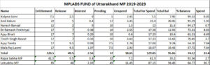 काशीपुर निवासी सूचना अधिकार कार्यकर्ता नदीम उद्दीन एडवोकेट ने उत्तराखंड के ग्राम विकास आयुक्त कार्यालय से सांसद निधि खर्च सम्बन्धी सूचना मांगी थी जिसके उत्तर में लोक सूचना अधिकारी/उपायुक्त (प्रशासन) सुधा तोमर द्वारा अपने पत्रांक 1109 के साथ सांसद निधि खर्च के जुलाई 2023 के विवरण उपलब्ध कराये गये है जिसमें जुलाई 2023 के अंत तक की उत्तराखंड के लोक सभा तथा राज्य सभा सांसदों को सांसद निधि खर्च का विवरण दिया गया है। नदीम के सूचना अधिकार प्रार्थना पत्र के उत्तर में भारत सरकार के सांसद निधि जारी करने वाले नोडल मंत्रालय सांख्यिकी और कार्यक्रम क्रियान्वयन मंत्रालय के लोक सूचना अधिकारी से सांसद निधि जारी करने सम्बन्धी विवरण एम पी लैडस वेबसाइट पर उपलब्ध होना सूचित किया है। बेवसाइट से 12 अक्तूबर 23 को उपलब्ध सूचना डाउन लोड करने पर उत्तराखंड के वर्तमान सांसदों की 77 करोड़ की सांसद निधि जारी न होने का खुलासा हुआ है।