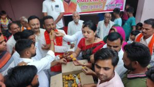 आपको बता दे की नैनीताल उधम सिंह नगर लोकसभा सीट पर भारतीय जनता पार्टी और कांग्रेस ने अपने प्रत्याशियों को जीतने के लिए एड़ी चोटी का जोर लगा रखा था और बाजपुर विधानसभा कांग्रेस से विधायक नेता प्रतिपक्ष यशपाल आर्य का गढ़ माना जाता है और उसी गढ़ में भारतीय जनता पार्टी के युवा नेता राजेश कुमार ने भाजपा के प्रत्याशी अजय भट्ट को भारी संख्या में वोट डलवाए और विजय हासिल करवाई,इसके बाद महुआखेड़ागंज वासियों ने भाजपा की नेत्री प्रियंका अग्रवाल और राजेश कुमार को बुलाकर लड्डुओं से तोला और एक दूसरे को मिठाई खिलाकर मुंह मीठा कराया। इतना ही नहीं क्षेत्रवासियों द्वारा मुख्य चौराहे पर जमकर आतिशबाजी , ढोल नगाड़े बजाकर अपनी खुशी का इजहार किया.