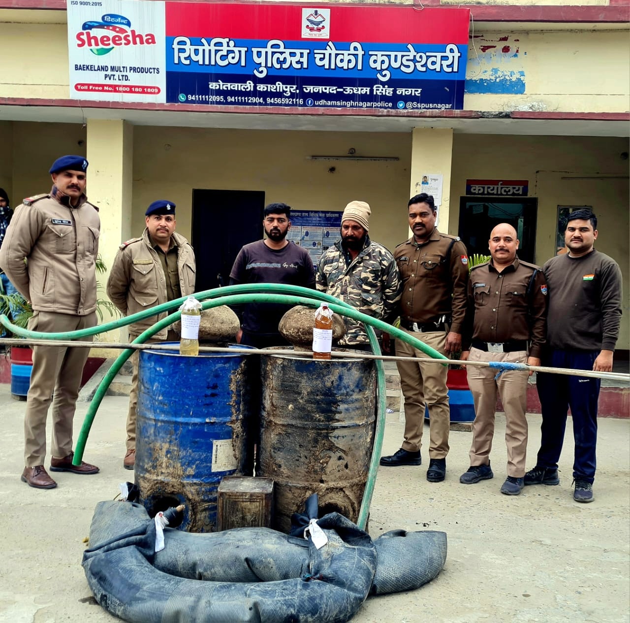 वरिष्ठ पुलिस अधीक्षक के निर्देश पर जनपदभर में अवैध शराब की रोकथाव व बिक्री पर कार्यवाही करते हुए कुंडेश्वरी चौकी पुलिस ने ग्राम गुलजारपुर के जंगल में अवैध शराब की कशीदगी करते ग्राम गोबरा बनगढ़ कोतवाली बाजपुर निवासी राकेश सिंह पुत्र जगजीत सिंह व यहीं के रघुवीर सिंह पुत्र प्यारा सिंह को गिरफ्तार कर उसके कब्जे से 02 रबड़ की टयूब में क्रमशः 50 और 45 कुल 95 लीटर अवैध कच्ची शराबए शराब बनाने में प्रयोग किए गये 02 लोहे के ड्रमए 02 प्लास्टिक पाइप, 02 एल्यूमीनियम पाइप, 02 मिट्टी की हांडी, 01 कनस्टर, 01 प्लास्टिक का डिब्बा बरामद कर दोनों अभियुक्तों का आबकारी अधिनियम की धारा 60,2 में अभियोग पंजीकृत कर न्यायालय के समक्ष पेश किया है। पुलिस टीम ने कार्यवाही के दौरान 95 लीटर कच्ची शराब व मौके पर करीब 5000 लीटर लाहन को नष्ट किया। पुलिस टीम में कुंडेश्वरी चौकी प्रभारी सुरेंद्र सिंह, उपनिरीक्षक संतोष देवरानी, कांस्टेबल त्रिभुवन सिंह, मुकेश कुमार, कुलदीप कुमार, मुख्य आरक्षी किशोर कुमार, कांस्टेबल किशोर फर्त्याल शामिल रहे।