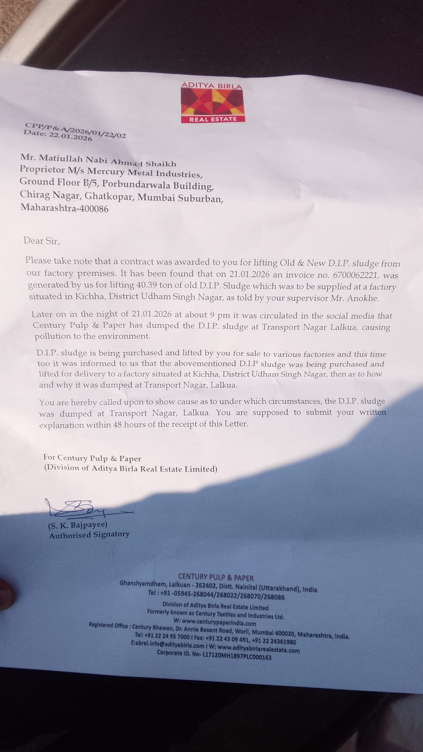 लालकुआं कोतवाली क्षेत्र के अंतर्गत रेलवे ट्रांसपोर्ट नगर स्थित टांडा रेंज की खाली वन भूमि पर सेंचुरी पेपर मिल की केमिकल युक्त स्लज (कचरा) डालने का मामला गरमाने के बाद मिल प्रबंधन ने कड़ा रुख अपनाया है। सोशल मीडिया पर इस घटना की खबरें प्रसारित होने के बाद मिल प्रबंधन ने त्वरित संज्ञान लेते हुए संबंधित ठेकेदार को ‘कारण बताओ नोटिस’ जारी किया और तत्काल प्रभाव से वहां से स्लज हटाने के निर्देश दिए। नोटिस मिलने के बाद ठेकेदार ने तत्परता दिखाते हुए उक्त केमिकल युक्त कचरे को वहां से उठवाकर निस्तारण के लिए काशीपुर भेज दिया है।