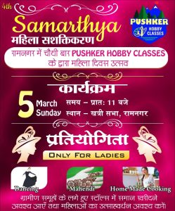 रामनगर में स्थित खत्री सभाभवन में महिला दिवस के शुभ अवसर पर पुष्कर हॉबी क्लासेज द्वारा महिलाशसक्तीकरण सामाजिक सरोकार व महिला उत्साहवर्धन के लिए महिलाओ के सम्मान और समाज मे उन्हें आगे बढ़ाने के लिए महिला दिवस के अवसर पर मेहंदी, नृत्य, पहाड़ी व्यंजन प्रतियोगिता कार्यक्रम किया जा रहा है।
