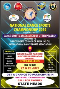 आपको बता दें कि एक बार फिर उत्तराखंड और उत्तर प्रदेश डांस स्पोर्ट्स एसोसिएशन के तत्वाधान में तथा पुस्कर सोसाइटी के सहयोग से दो दिवसीय राष्ट्रीय स्तरीय डांस सपोर्ट प्रतियोगिता का आयोजन प्रथम बार उत्तराखंड के रामनगर की सरजमीं पर दिनांक 27 व 28 जुलाई 2024 को आयोजित किया जा रहा है।