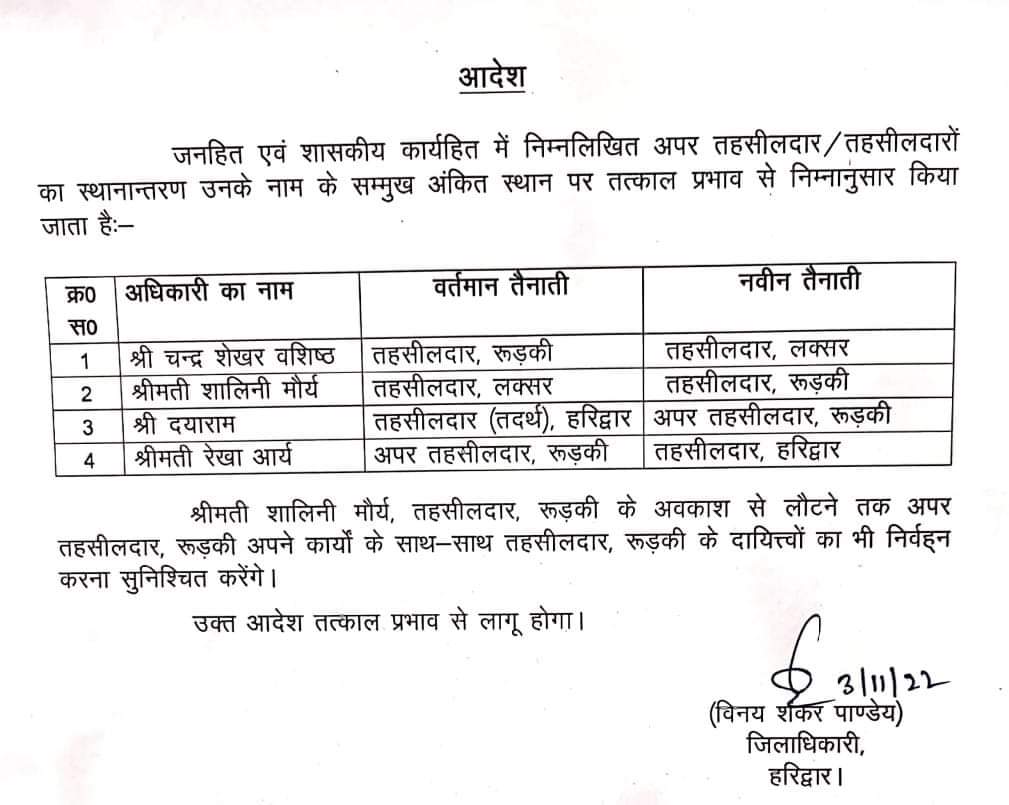 रूड़की से अपर तहसीलदार रेखा आर्य को हरिद्वार तहसीलदार का जिम्मा सोपा।