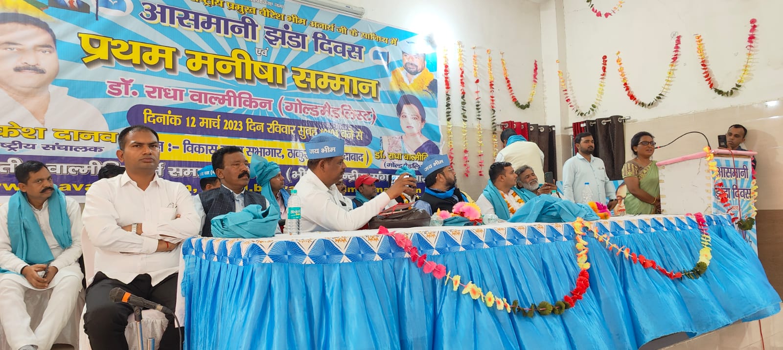 कार्यक्रम की अध्यक्षता वीरेश भीम अनार्य ने की। मुख्य अतिथि अनिरुद्ध चौहान एवं विशिष्ट अतिथि गौरव चौहान रहे। कार्यक्रम का संचालन प्रदेश अध्यक्ष आकाश आनंद ने किया। कार्यक्रम को संबोधित करते हुए वीरेश भीम अनार्य जी ने कहा की आसमानी झंडे की स्थापना 8 मार्च 1992 को रामपुर में हुई थी। इसलिए प्रत्येक वर्ष 8 मार्च को आसमानी झंडा दिवस मनाया जाता है। 8 मार्च को अंतर्राष्ट्रीय महिला दिवस भी मनाया जाता है महिला दिवस के उपलक्ष में भावाधस भीम द्वारा प्रथम मनीषा सम्मान की शुरुआत की जा रही है जो प्रत्येक वर्ष दलित समाज में उत्कृष्ट कार्य करने वाली दलित महिला को दिया जाएगा। आज दलित समाज शिक्षित हो चुका है परंतु दलित समाज को अपने इतिहास की जानकारी होनी बहुत जरूरी है। इतिहास की जानकारी के साथ-साथ धार्मिक शिक्षा की जानकारी भी होना जरूरी है। घर की बेटी पढ़ गई तो वह अपनी आने वाली संतान को पढ़ा सकती है। इसलिए बेटियों का पढ़ा होना बहुत जरूरी है। दलित समाज को चाहिए कि वह अंधविश्वासों, आडंबरो और जुआ शराब जैसी बुराइयों को त्यागते हुए समाज को एक नई दिशा में ले जाएं। यह सब तभी संभव है जब दलित समाज एक झंडे के नीचे संगठित होगा और संघर्ष करेगा। कार्यक्रम में राहुल राही, सतीश परछा, किरेंद्र, अंकित वाल्मीकिन, अनिल कुमार, दीपक, करन कुमार, अनिल कुमार, अमित कुमार, चंद्रपाल, सुरेश फौजी, चंद्रशेखर, शिवनंदन टाक, मनोज पवार, अमन चौधरी, गौरव, सौरभ, कुमार विनय, राजेंद्र भील आदि कार्यकर्ता मौजूद रहे।