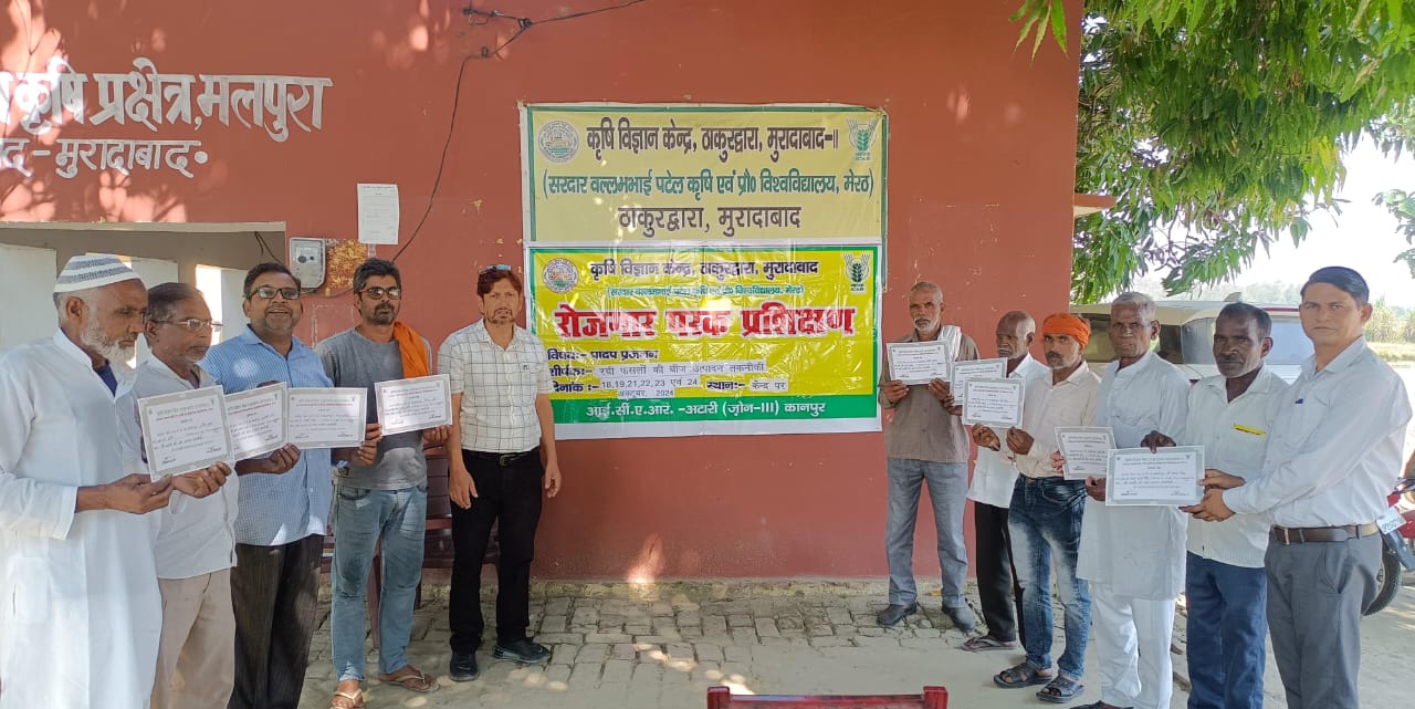 कृषि विज्ञान केंद्र, ठाकुरद्वारा के तत्वावधान में दिनांक 18-19 एवं 21-24 अक्टूबर, 2024 तक कुल 06 दिन का रोज़गार परक प्रशिक्षण विषय “रबी फसलों की बीज उत्पादन तकनीकी” पर डॉ हसन तनवीर द्वारा गेहूं, सरसों, चना, मटर, मसूर आदि फसलों के बीज उत्पादन तकनीकी के बारे में विस्तार से जानकारी दी एवं कृषको को स्वयं का बीज बनाने के लिए प्रेरित किया गया। प्रशिक्षण में डॉक्टर दीपक द्वारा विभिन्न फसलों के कीट एवं बीमारियों के बारे में व उसके उपचार विषयक विस्तार से जानकारी दी गई। केंद्र के प्रभारी अधिकारी डॉक्टर रविंद्र कुमार द्वारा कार्यक्रम में कृषि विज्ञान केंद्र के उद्देश्यों के बारे में विस्तार से बताया गया। कुल 10 कृषकों मदन सिंह, दीपक शर्मा, कुलदीप शर्मा, जदिर हुसैन, मितान सिंह, सुंदर सिंह, सर्वेश कुमार, नीरज कुमार, नरेश सिंह व ओमप्रकाश द्वारा प्रशिक्षण प्राप्त किया गया।