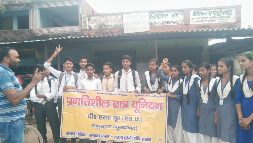 ठाकुरद्वारा : गुरुवार को निकटवर्ती ग्राम रामू वाला गणेश पर प्रगतिशील छात्र यूनियन के के तहसील संयोजक सचिन कुमार के नेतृत्व में भारी संख्या में छात्र छात्राएं इकट्ठा हुए। तथा जोरदार प्रदर्शन करते हुए नवोदय विद्यालय को जाने वाली क्षतिग्रस्त सड़क का पुनः निर्माण कराने की मांग की।