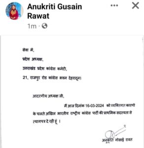 अनुकृति गुसाईं रावत ने छोड़ा कांग्रेस का हाथ