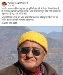 उत्तराखंड भाजपा से दुखद खबर सामने आ रही है। जहां पूर्व कैबिनेट मंत्री एंव बीजेपी के वरिष्ठ नेता केदार सिंह फोनिया का आज निधन हो गया। केदार सिंह फोनिया लंबे समय से बीमार चल रहे थे। उनके निधन पर सीएम धामी समेत कई नेताओं ने शोक व्यक्त किया है। सीएम धामी का कहना है कि बीजेपी के वरिष्ठ नेता एवं पूर्व कैबिनेट मंत्री केदार सिंह फोनिया जी के निधन से वह दुखी है और भगवान दिवंगत आत्मा को अपने श्रीचरणों में स्थान दें। बता दें कि केदार सिंह फोनिया उत्तराखंड के दिग्गज नेता थे। उन्होंने प्रदेश की राजनीति में