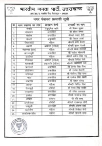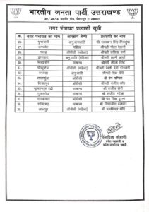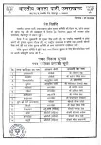 उत्तराखंड में नगर निकाय चुनावों की सरगर्मियों के बीच भारतीय जनता पार्टी ने प्रत्याशियों के चयन की प्रक्रिया पूरी कर ली है। तीन दिनों तक चले गहन मंथन और बैठकों के बाद प्रदेश चुनाव समिति द्वारा तैयार उम्मीदवारों की सूची पर शीर्ष नेतृत्व ने अपनी मुहर लगा दी है।