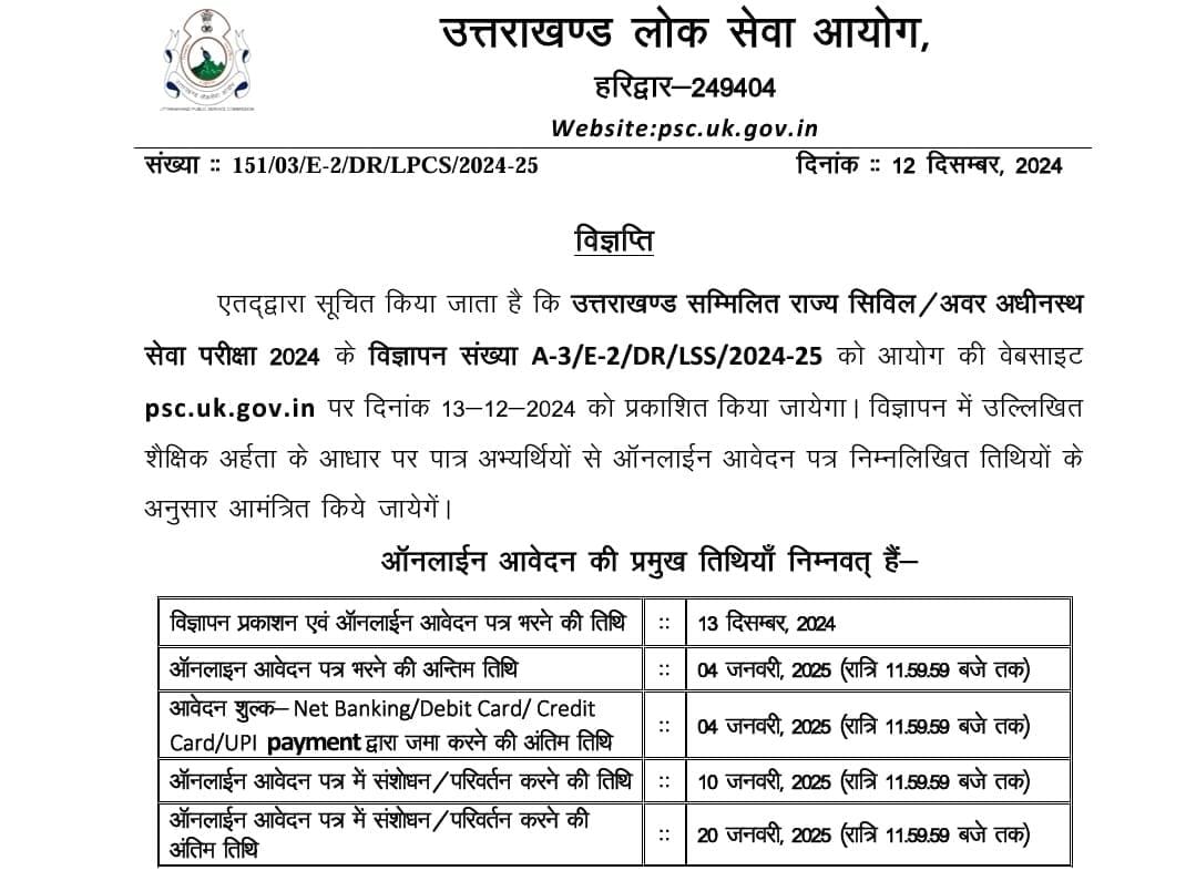 उत्तराखंड लोक सेवा आयोग ने राज्य सिविल सेवा परीक्षा 2024 की अधिसूचना जारी की, आवेदन 13 दिसंबर से शुरू